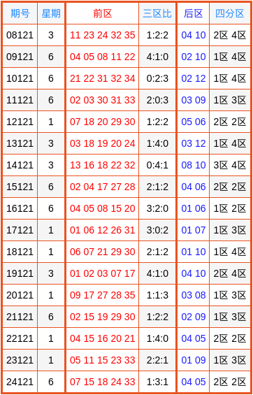 二区分析【13-24】:在积年大乐透第121期同时奖号中,该区开出率为37.65%,施展尽头活跃。本期瞻望该区出号1枚,推选出号温暖:21。